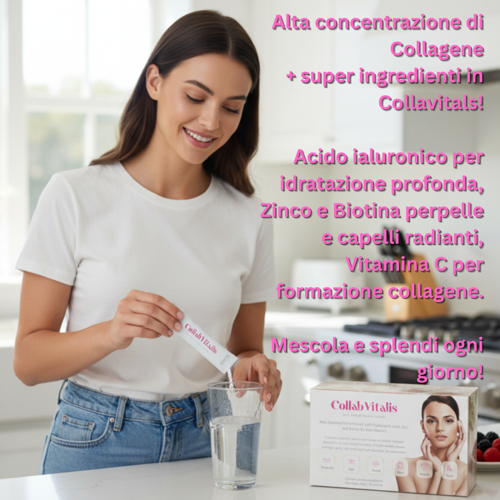 Come fai a sapere se hai una carenza di collagene? Il modo più rapido per accorgertene è se le tue unghie si spezzano facilmente e sono fragili e se i tuoi capelli sono secchi e radi. Altri segnali di avvertimento sono anche se hai problemi di dolori articolari, gonfiore, squilibri ormonali e se noti sempre più rughe sul tuo viso. È stato dimostrato che dopo i 20 anni, perdiamo almeno l’1% di collagene ogni anno aggiuntivo e, sfortunatamente, non possiamo evitarlo. Ma non preoccuparti, con l’integratore alimentare Collab Vitalis Collagen, puoi assicurarti che il tuo corpo inizi di nuovo a produrre collagene in pochi mesi, ripristinando così l’energia e la forza di cui ha bisogno per il normale funzionamento.